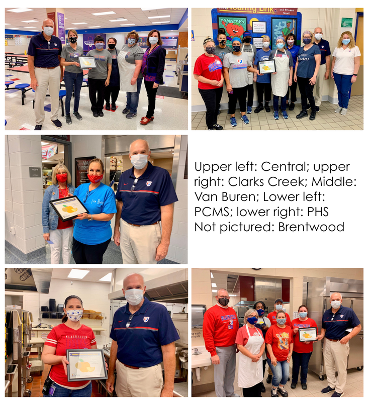 While Mrs. Collins was honored at last evening’s school board meeting, Mr. Olinger presented each school cafeteria manager and her team with their own award this morning, emphasizing his appreciation for the extra miles they’ve gone in adapting to the many challenges we’ve faced in the last 12 months.