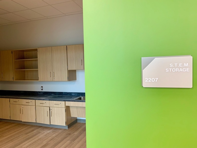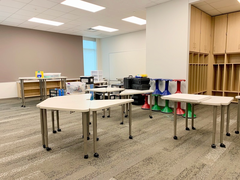 Above two photos: Each community has its own STEM storage and workspace, including a sink, plenty of accessible storage, and overhead door for larger equipment and student projects.