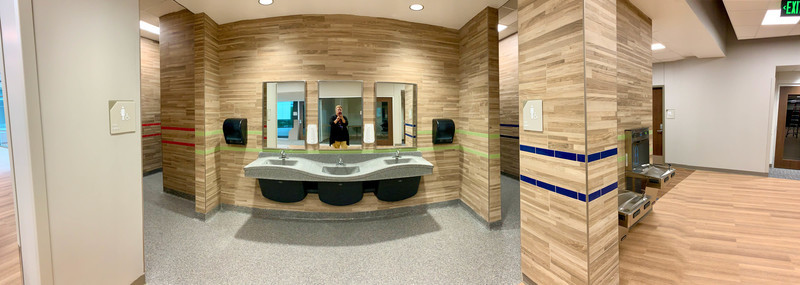 Above: panoramic view of restrooms, drinking fountain and bottle filler, which will be present in every community (every grade level area). NOTE: while drinking fountains and bottle fillers may appear short for 5th graders, they are installed based on ADA compliance!