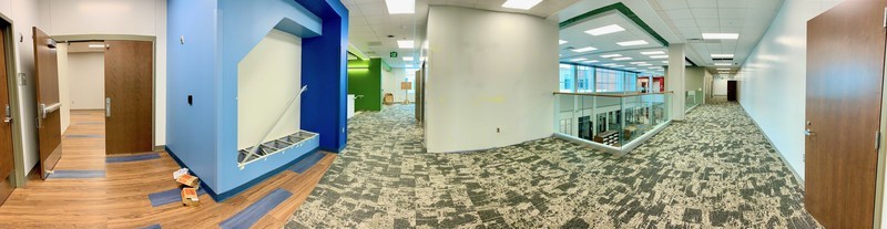 Above: panoramic view of upper hallway, starting with 5th grade on the left, moving across the north side of the school and showing the view down into the Discovery Center in the middle.