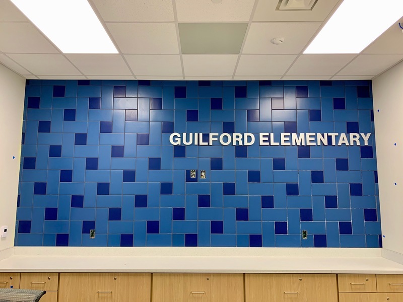How will my child find their way once inside the school? Guilford Elementary was designed so that each grade level is grouped by community, and each community features design and graphic elements featuring a unique color.