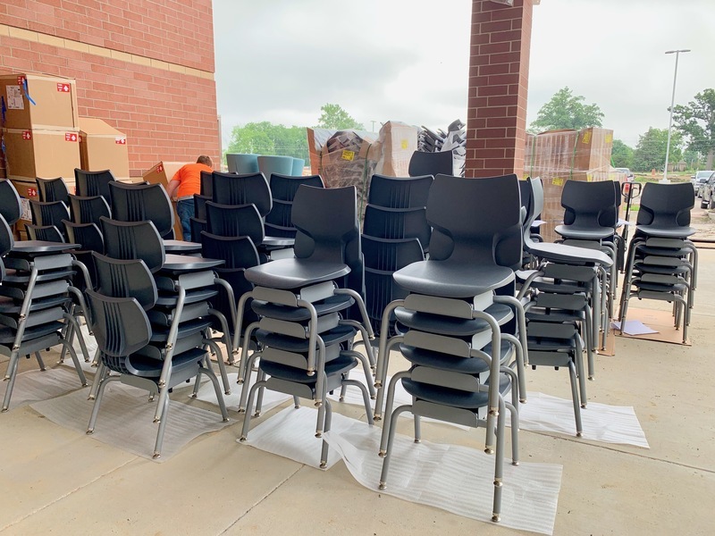 Above: Just this morning, more chairs were being unloaded and unboxed before being moved into classrooms!