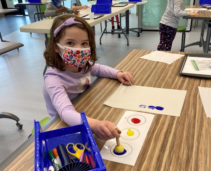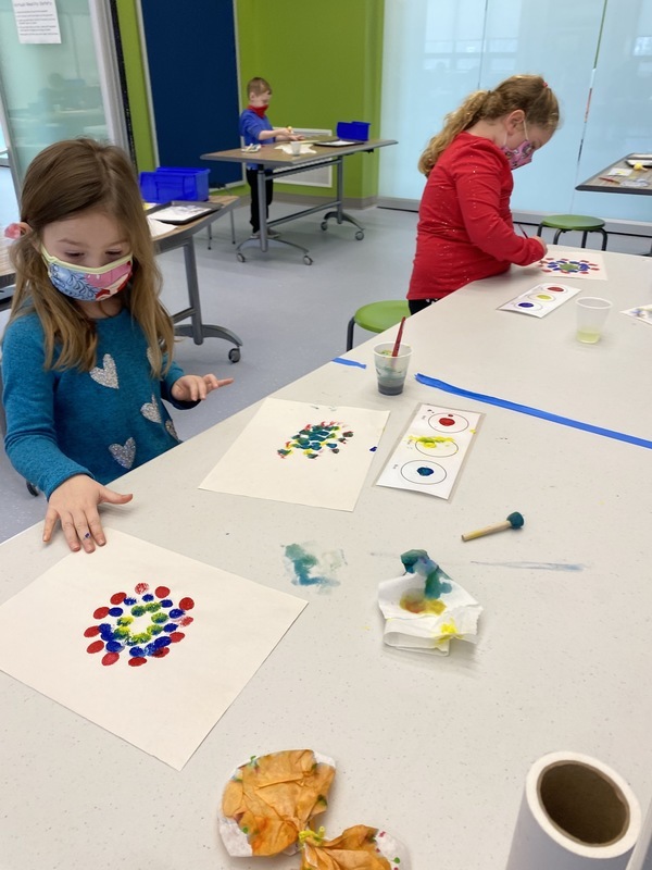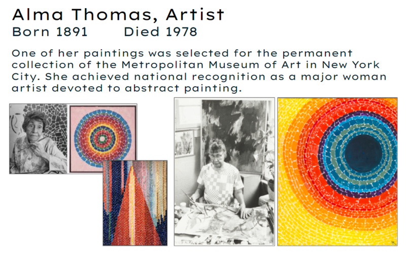 Kindergarten students learned about artist Alma Thomas, and used tempera paint, sponges and brushes to paint in her style.